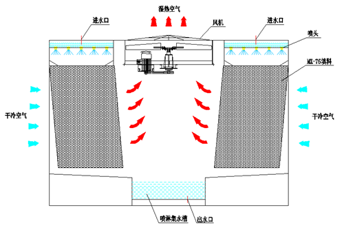 熱源出來的熱水流入冷卻塔的上部散水槽中,受重力作用,通過散水孔均勻地噴灑在填料表面,同時,空氣由冷卻塔兩側(cè)的進(jìn)風(fēng)格柵進(jìn)入,橫掠填料,并與噴淋水形成橫流,一小部分水被蒸發(fā),從而帶走熱量,降低水溫。熱濕空氣由頂部的通風(fēng)機(jī)排到周圍大氣中,被冷卻的水則落到集水盤后重新回到熱源。